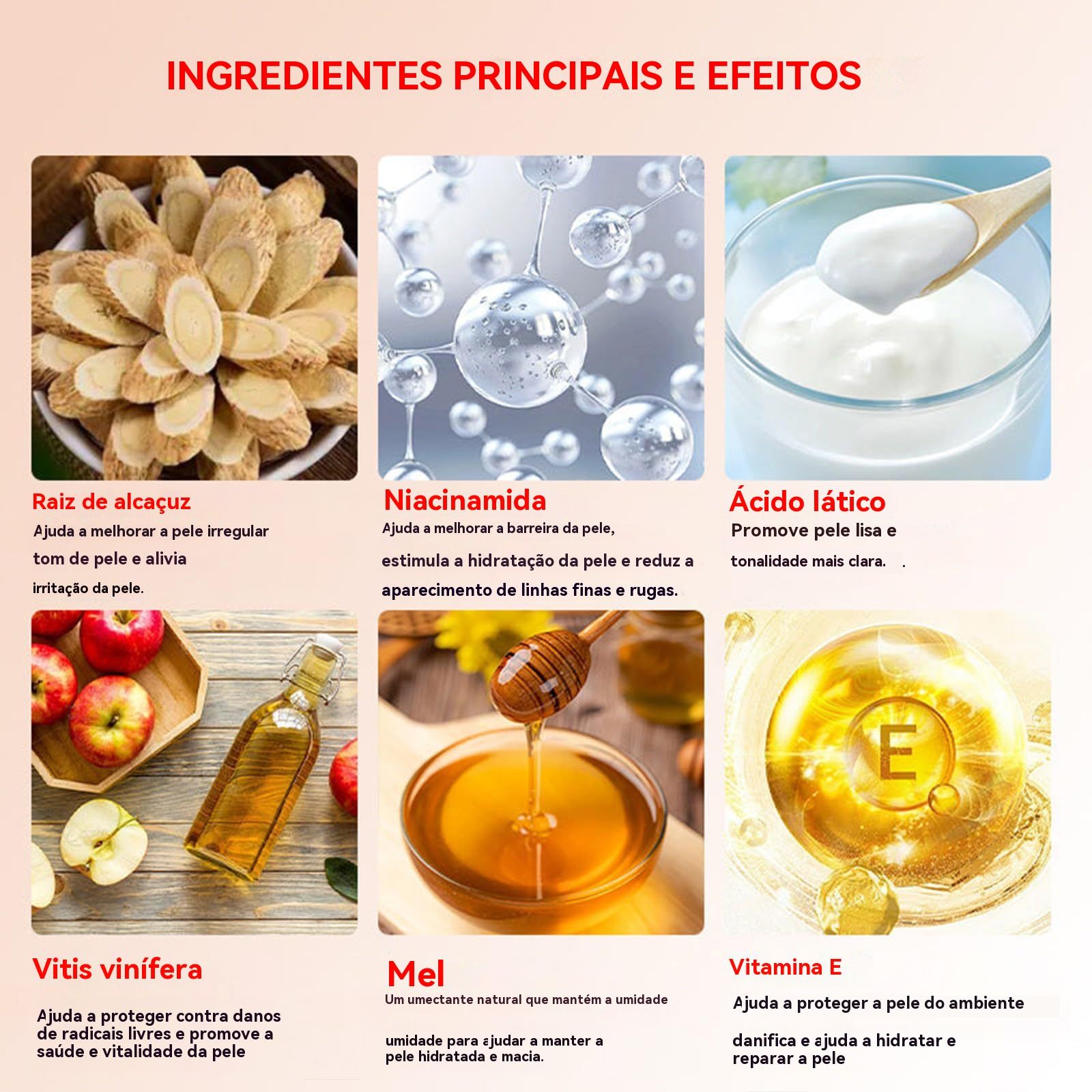 • 🔬【Combo de Ingredientes Poderosos】Raiz de Liquorice + Niacinamida + Ácido Láctico + Vitamina E… Clareamento, estabilidade, hidratação e antioxidante, tudo junto!